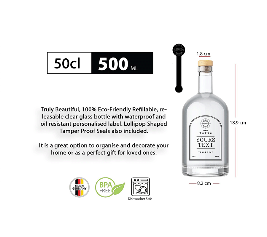 Custom Reusable 500ml Glass Bottles with Cork, Personalised Storage Bottle